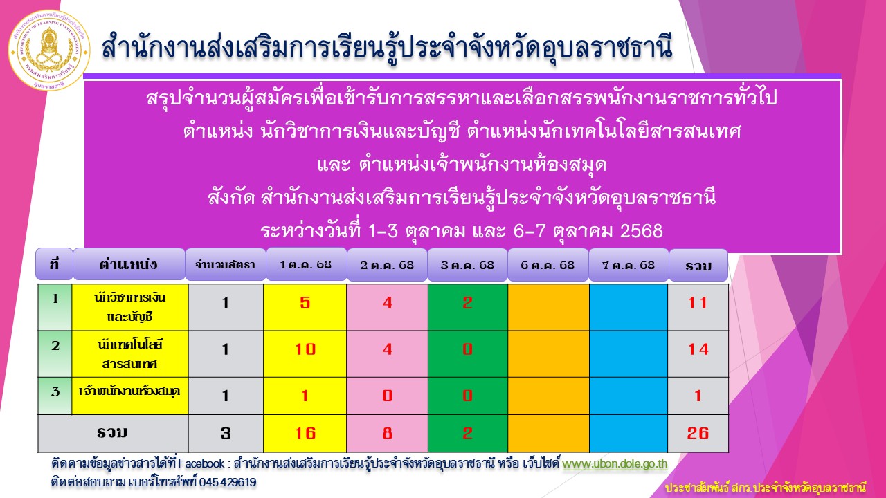 สรุปจำนวนผู้สมัครเพื่อเข้ารับการสรรหาและเลือกสรรพนักงานราชการทั่วไป ตำแหน่ง นักวิชาการเงินและบัญชี ตำแหน่งนักเทคโนโลยีสารสนเทศ และ ตำแหน่งเจ้าพนักงานห้องสมุด สังกัด สำนักงานส่งเสริมการเรียนรู้ประจำจังหวัดอุบลราชธานี ระหว่างวันที่ 1-3 ตุลาคม และ 6-7 ตุลาคม 2568