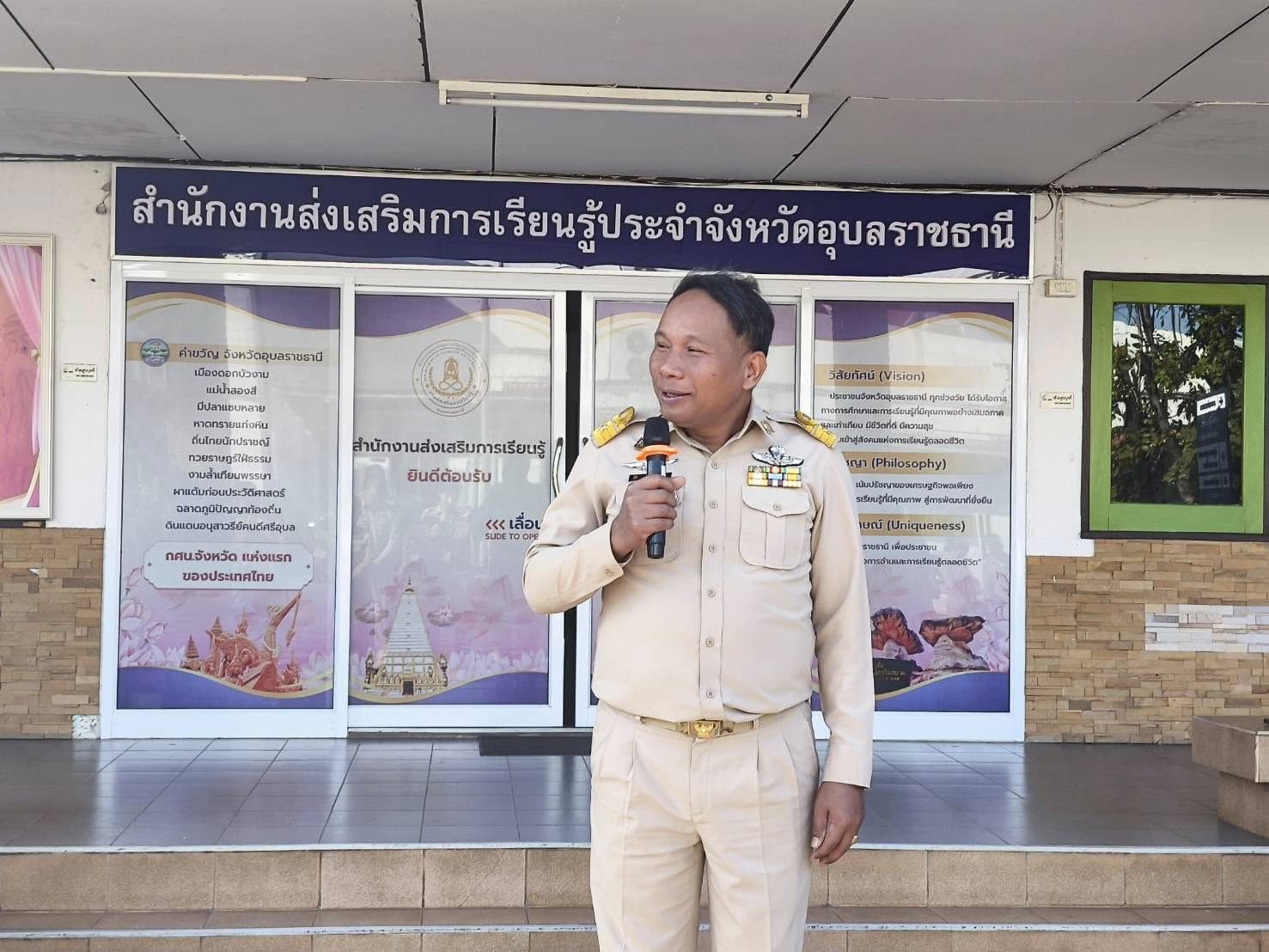 ดร.ถาวร พลีดี ผู้อำนวยการสำนักงานส่งเสริมการเรียนรู้ประจำจังหวัดอุบลราชธานี วิทยฐานะเชี่ยวชาญพิเศษ นำบุคลากรและ คณะครู สกร.ระดับอำเภอเมืองอุบลราชธานี ทำกิจกรรมเคารพธงชาติและร้องเพลงชาติสวดมนต์ไหว้พระ เพื่อแสดงความจงรักภักดีต่อชาติ ศาสนา และสถาบันพระมหากษัตริย์ ณ บริเวณหน้าเสาธง สำนักงาน สกร.ประจำจังหวัดอุบลราชธานี ทั้งนี้ นายถาวร พลีดี ผู้อำนวยการสำนักงานส่งเสริมการเรียนรู้ประจำจังหวัดอุบลราชธานี ได้กล่าวพบปะพูดคุยกับบุคลากร และมอบหมายภารกิจในการดำเนินงานการจัดกิจกรรมในรอบสัปดาห์