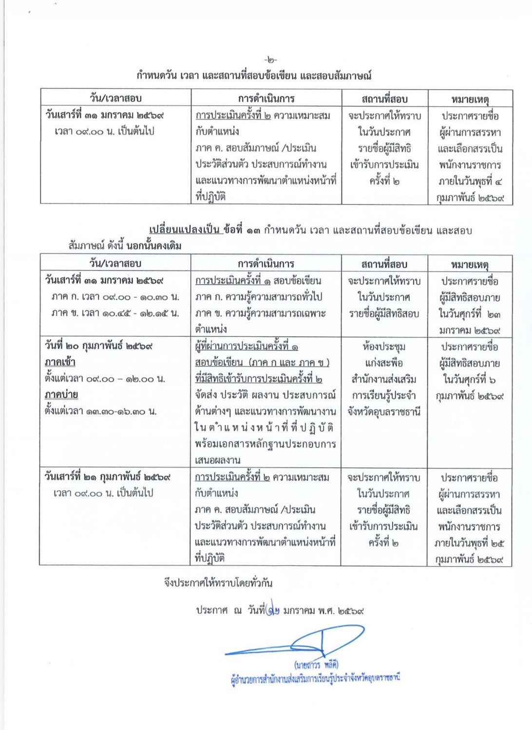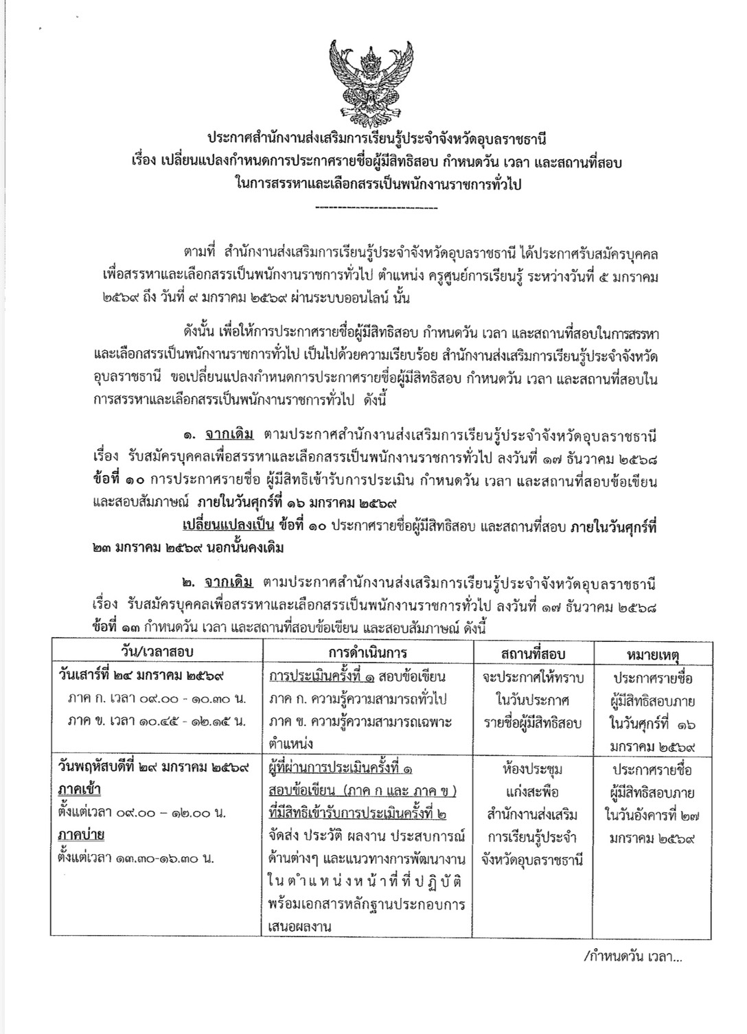 เรื่อง เปลี่ยนแปลงกำหนดการประกาศรายชื่อผู้มีสิทธสอบ กำหนดวัน เวลา และสถานที่สอบ