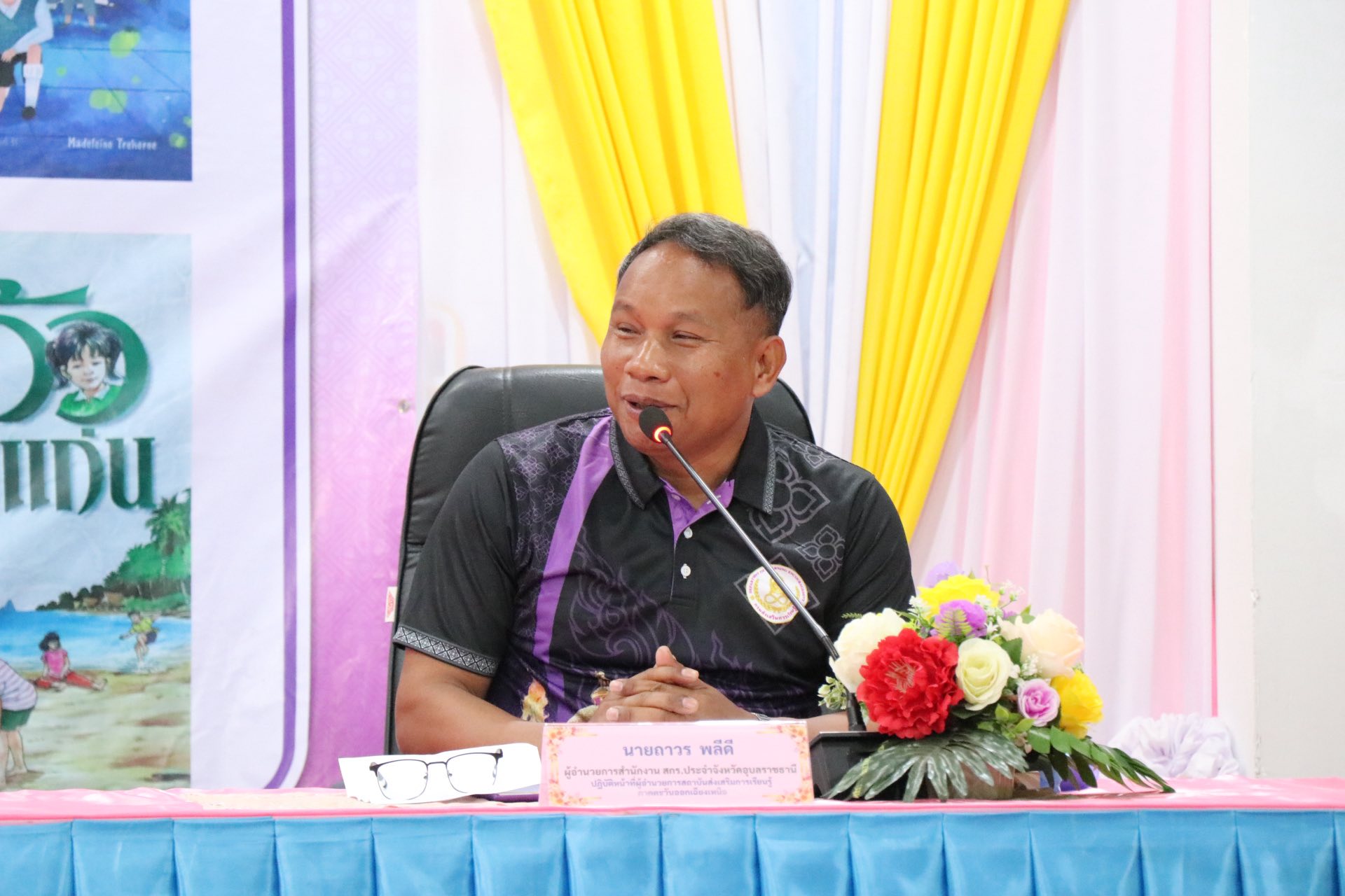 ดร.ถาวร พลีดี ผอ.สกร.ประจำจังหวัดอุบลราชธานี ประธานกลุ่มสำนักงาน สกร.จังหวัด กลุ่มสามเหลี่ยมมรกต เป็นประกล่าวเปิดโครงการแข่งขันตอบคำถามหนังสือพระราชนิพนธ์ฯ กลุ่มสำนักงาน สกร.จังหวัด “กลุ่มสามเหลี่ยมมรกต” ณ ห้องประชุม ศูนย์การเรียนรู้ศาสตร์พระราชา “เดินตามรอยพ่อ” สกร. สำนักงานส่งเสริมการเรียนรู้ประจำจังหวัดยโสธร
