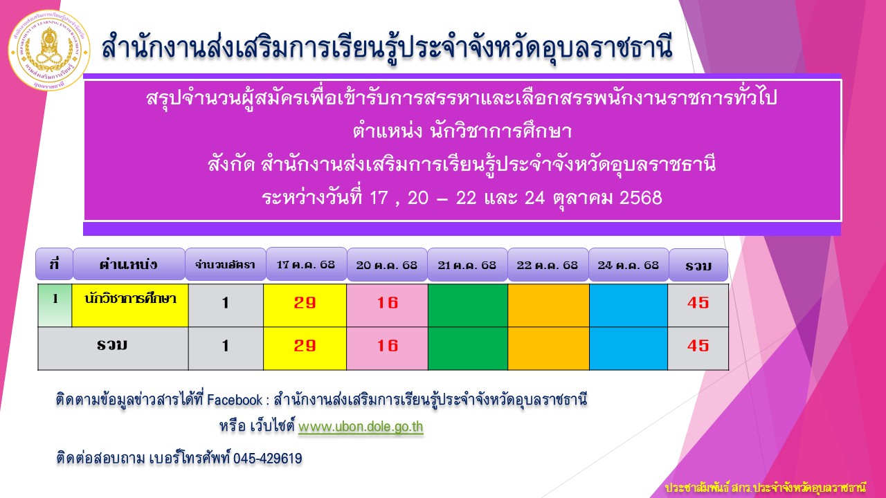 สรุปจำนวนผู้สมัครเพื่อเข้ารับการสรรหาและเลือกสรรพนักงานราชการทั่วไป ตำแหน่ง นักวิชาการศึกษา สังกัด สำนักงานส่งเสริมการเรียนรู้ประจำจังหวัดอุบลราชธานี ระหว่างวันที่ 17, 20-22 และ 24 ตุลาคม 2568